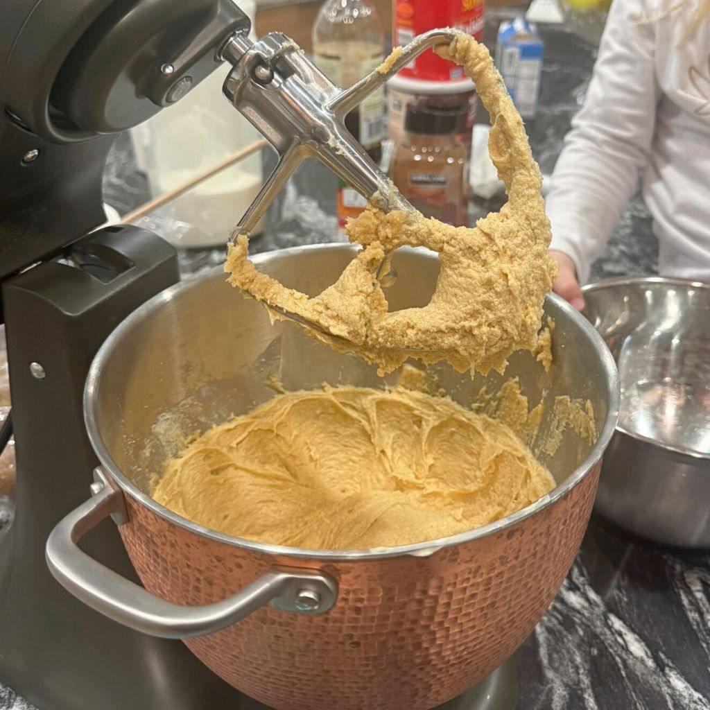 • With your mixer on a slow speed, slowly add in the dried ingredients to your mix until the dough starts to form.